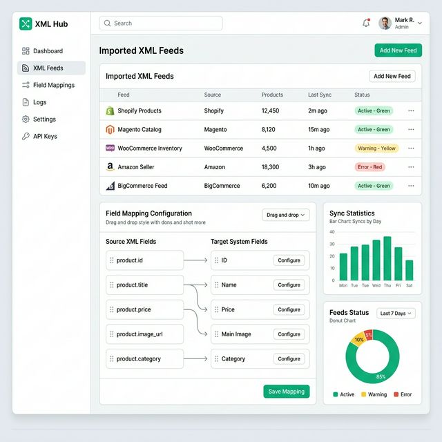 Görsel eşleştirme arayüzü ile kaynak XML alanlarını hedef alanlarınızla eşleştirin. Fiyat, stok ve kategori kurallarını tanımlayın.