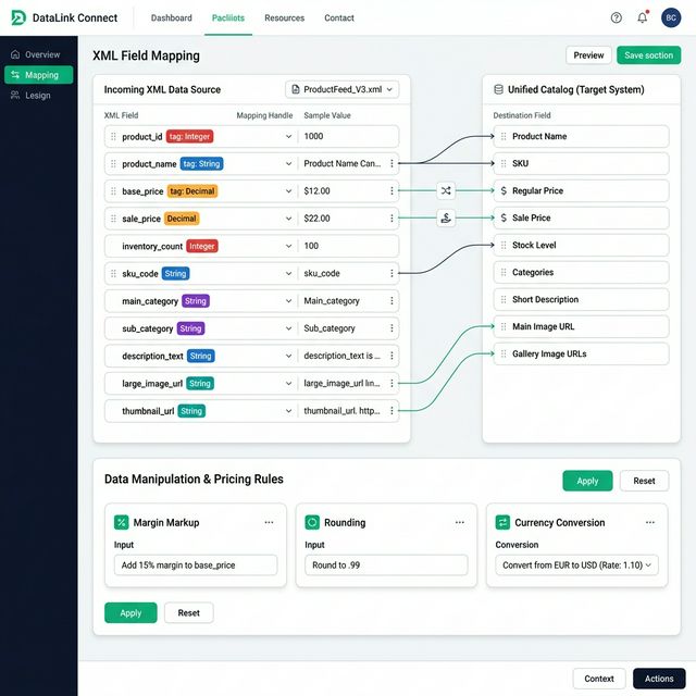 Her XML kaynağının alanlarını (ürün adı, fiyat, stok, barkod, kategori, görsel URL vb.) kendi standart alanlarınızla görsel sürükle-bırak arayüzü ile eşleştirin. Fiyat alanlarına kâr marjı (%15 gibi), yuvarlama kuralları (.99 formatı), döviz çevirme ve KDV hesaplama gibi manipülasyon kuralları tanımlayın. Stok miktarlarını filtreleyin, minimum stok eşiği belirleyin ve kategorileri kendi hiyerarşinize göre yeniden düzenleyin.
