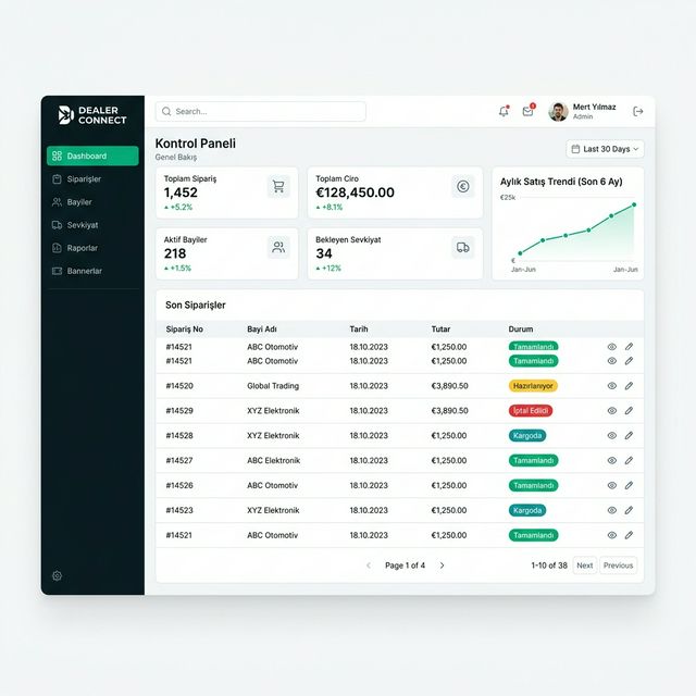 Firma yöneticileri, web tabanlı kontrol paneli üzerinden gelen siparişleri onaylar, sevkiyat süreçlerini yönetir ve bayi bazlı satış raporlarını inceler. Bayi ekleme/düzenleme, ürün kataloğu güncelleme, banner yayınlama ve fiyat politikası belirleme işlemleri tek merkezden yapılır. Detaylı analiz grafikleri ile aylık satış trendleri, en çok satan ürünler ve bayi performansları raporlanır.
